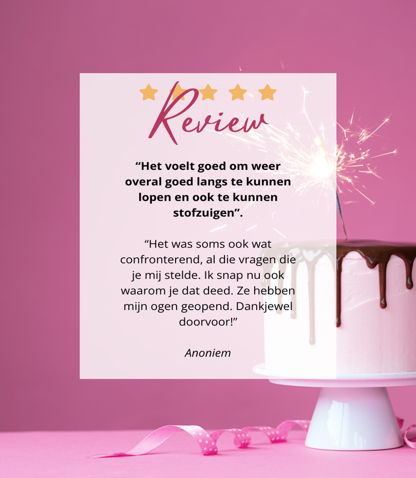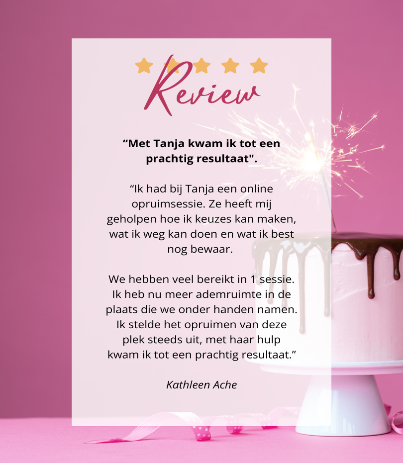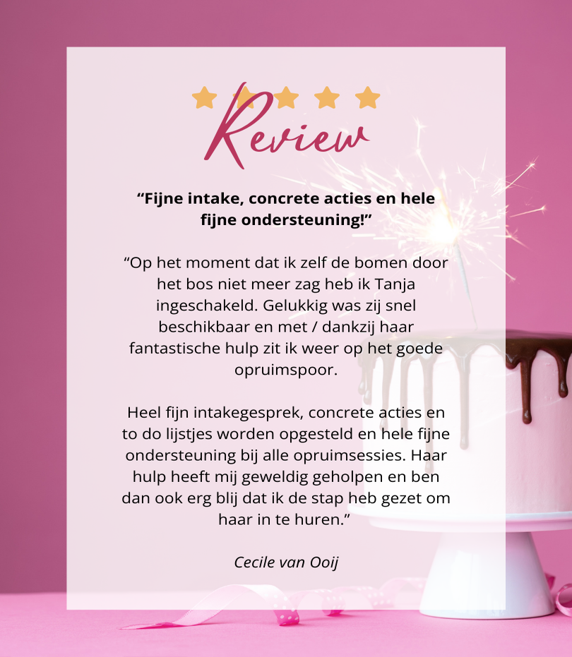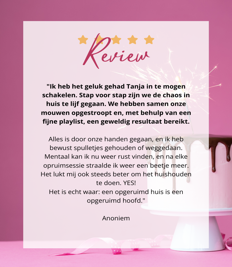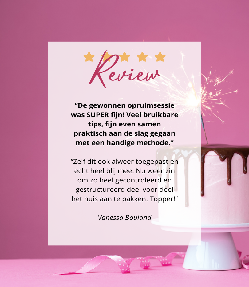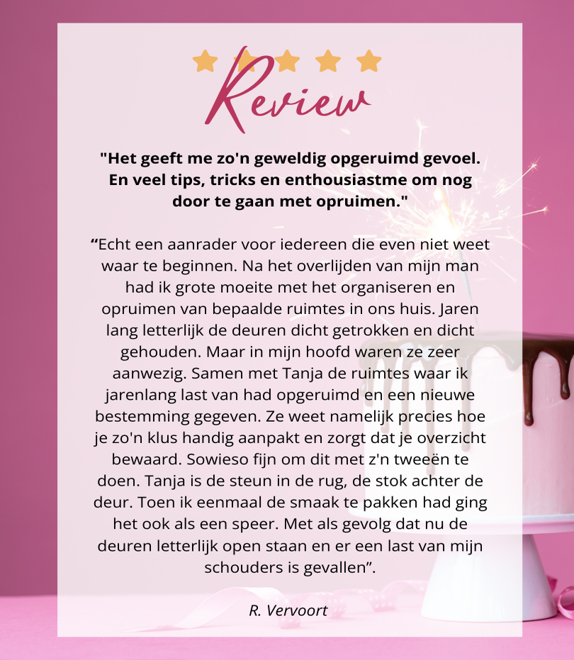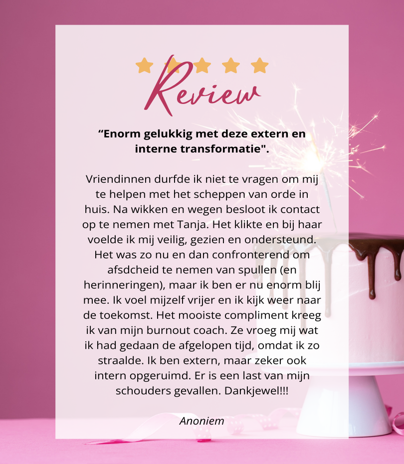 Op deze pagina lees je ervaringen van vrouwen die die stap al hebben gezet. Zij delen hoe het was om met mij samen te werken, wat het hen heeft opgeleverd, en hoe het voelt om weer grip te krijgen op hun spullen én hun leven.